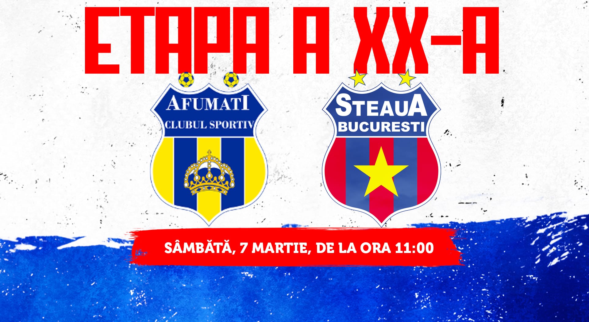 Etapa 20: CS Afumaţi – Steaua Bucureşti 🗓️ Sâmbătă, 7 martie, de la ora 11:00🏟️ Stadionul TBA🎫 Bilete TBA📽️ Meciul este transmis de TBA Aici, albumul de meci. Source Navigare în articole ÎCCJ: Palmaresul Stelei rămâne la CSA Steaua